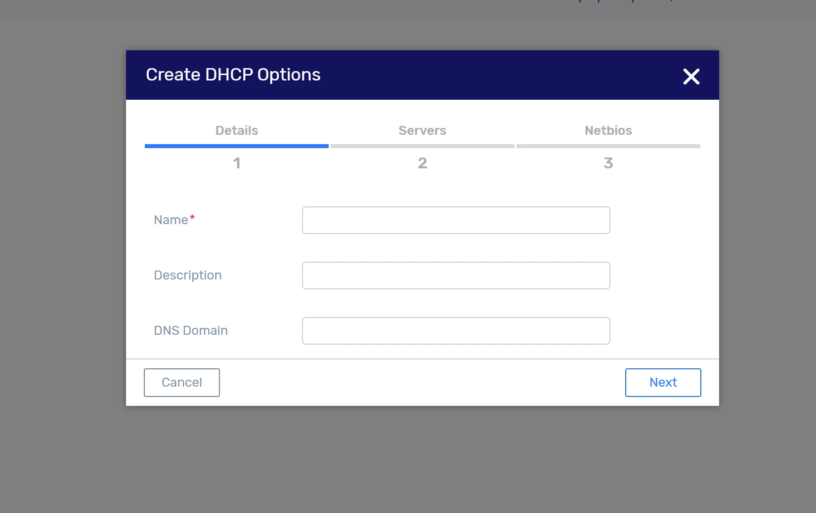 DNS Servers: The IP address of the DNS server associated with the defined DHCP options set. Defining a DNS server is optional.