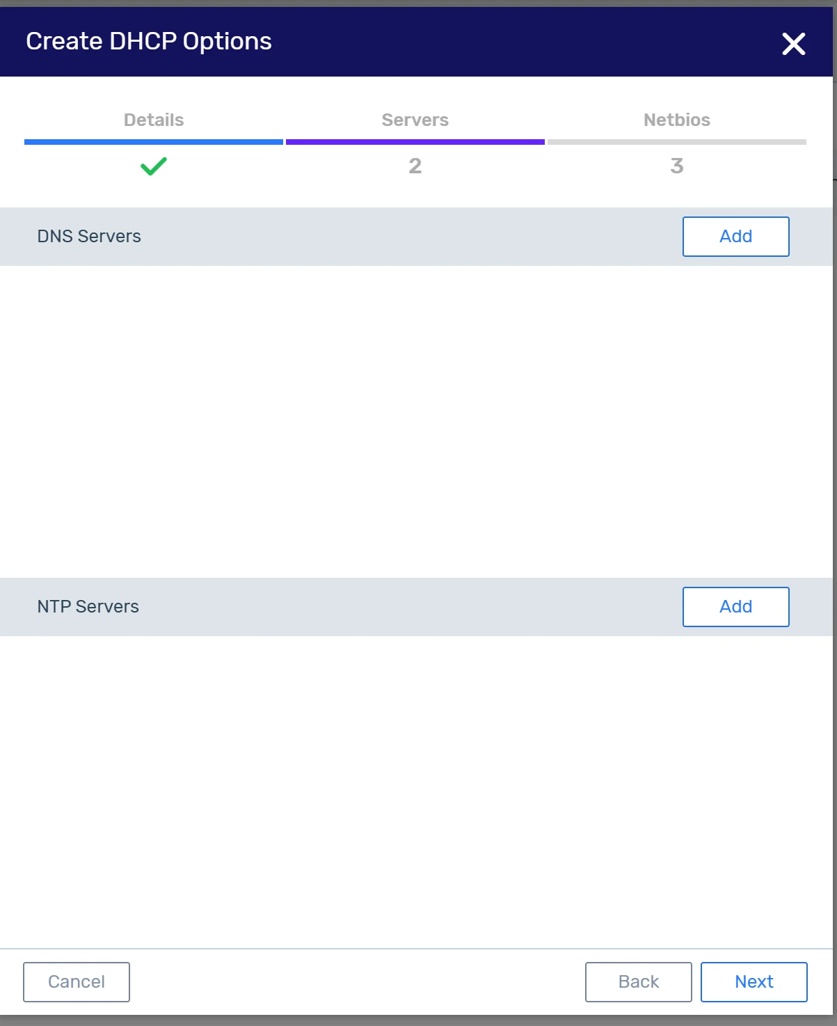 NTP Servers: The IP address of the NTP server associated with the defined DHCP options set. Defining an NTP server is optional.
