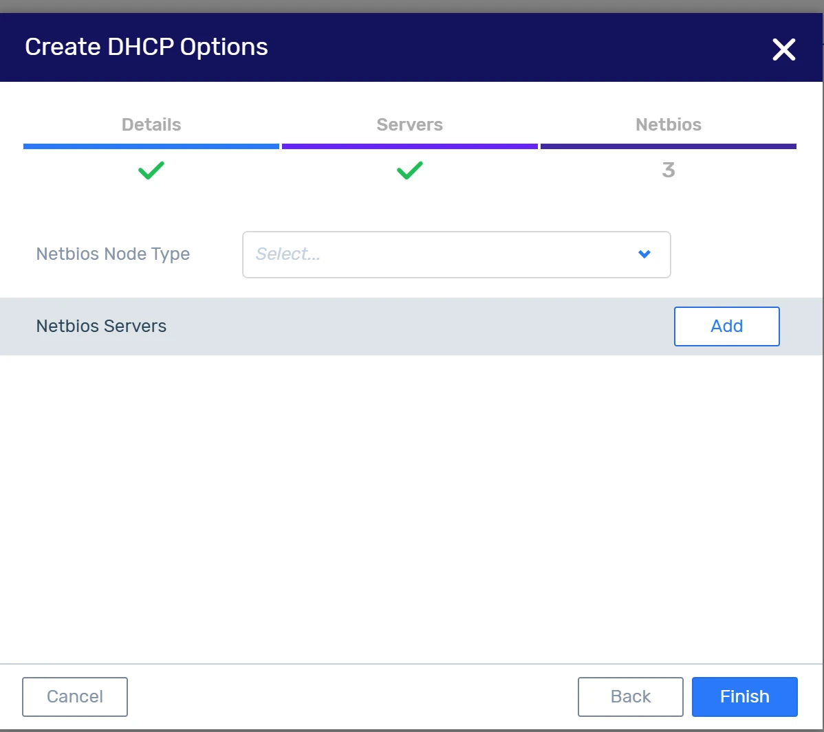 • NetBIOS Servers (optional, for Windows resources): These options are configured to support Windows services that rely on NetBIOS, such as NetBIOS over TCP/IP.